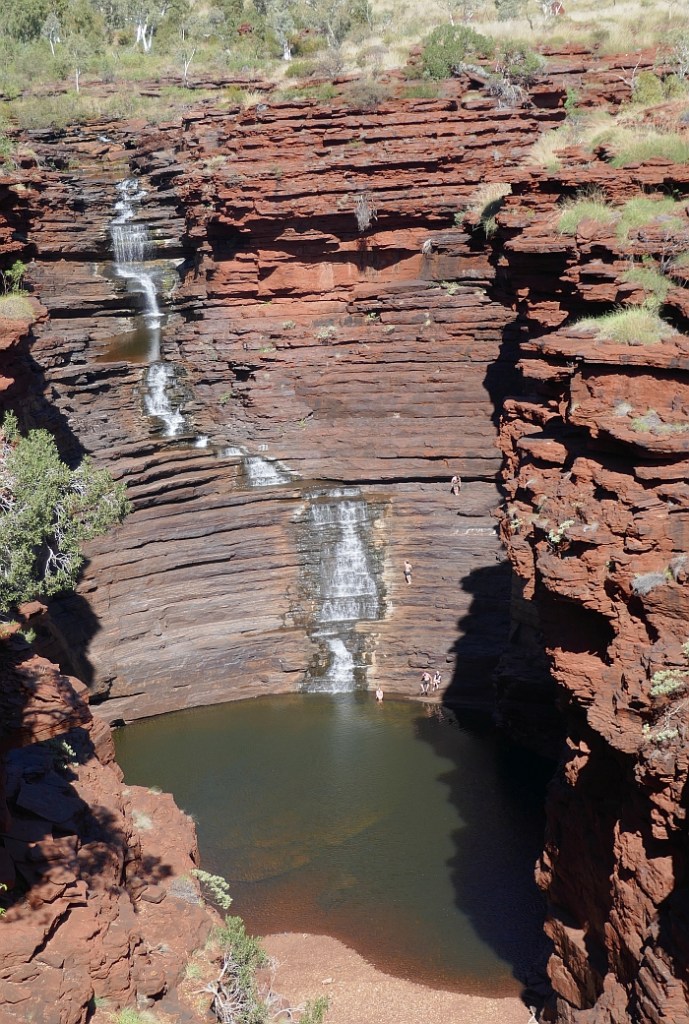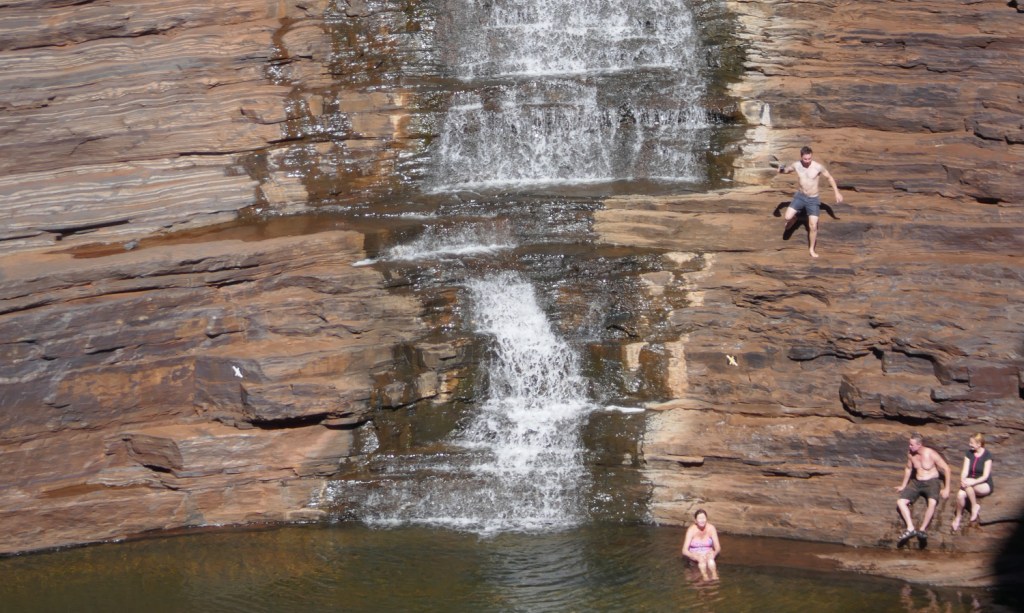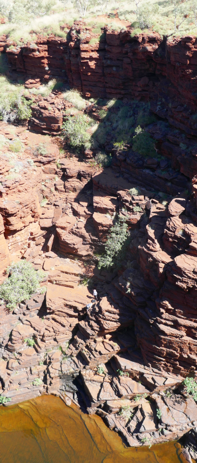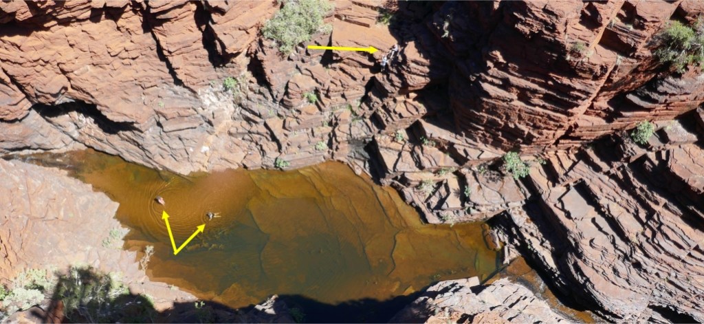 To my surprise I was able to spot my three amigos sitting peacefully at the edge of the waterfall below. The goal of any gorge walk in Karijini is to be able to have a swim at the end of the trek and then sit on the banded ironstone formations of a natural amphitheatre around a water-hole, contemplating how lucky you are. First Nation people who lived in this country before European arrivals no doubt visited the waterfalls and pools of Karijini and if any spot in the region would be considered a sacred site, this would be one of them. Its local name is Jijingunha. Archaeologists have found evidence of indigenous habitation in the area dating to around 1800 years old. This is a ‘young’ date compared to places like Kakadu, illustrating the difficulty of food sourcing for hunter gatherers in the Pilbara region.