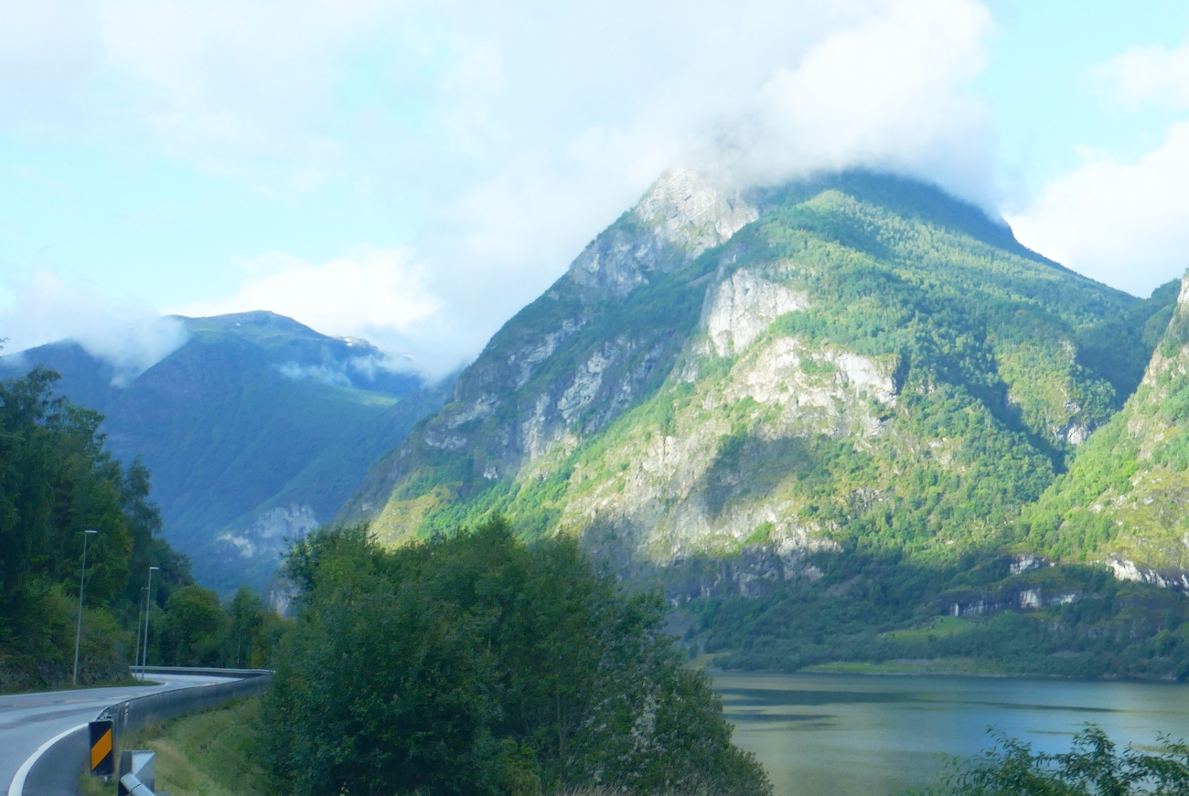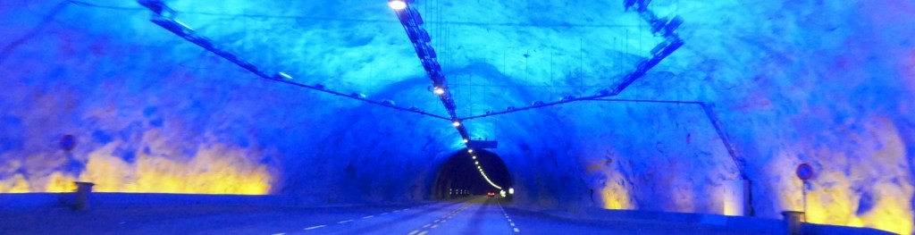 It was serious mountain and fjord country for the first third of our journey. As can be seen in the images above, it is beautiful country but getting out of the valleys over the mountains was no longer an option for Norwegians. The tunnel borer would be brought in and a hole in the mountain would be created for the short cut. Below is a photo taken halfway through a mountain tunnel on this road and its colours give some hint of the strange, alien world our drive regularly became.