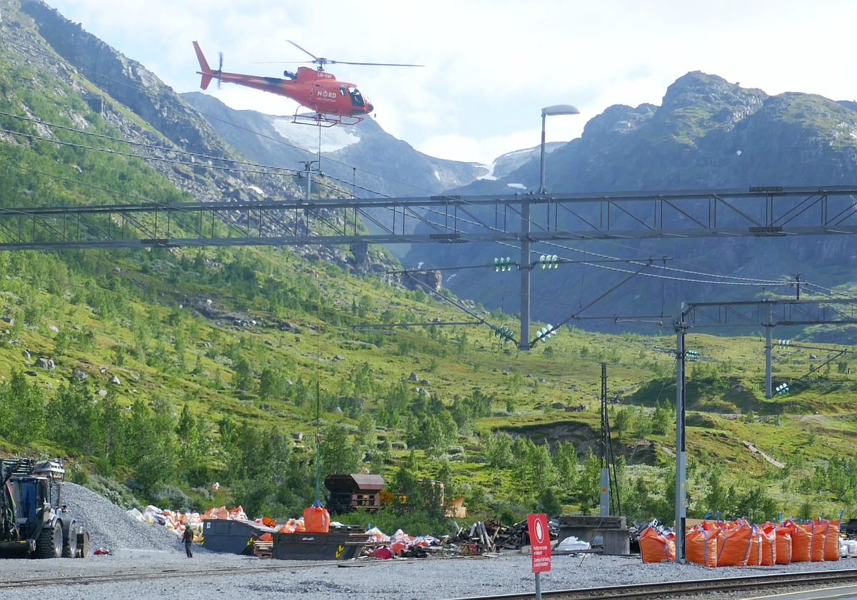 We had to wait half an hour at Myrdal train station but for some unknown reason, we were entertained by a helicopter pilot who kept collecting orange bags of rubble from a site behind the Vatnahalsen Hotel and bring them down on a long rope and drop them at a point at the end of Myrdal’s train platform. He was a very skillful as well as noisy helicopter pilot.