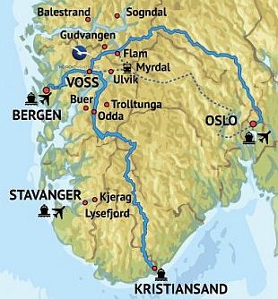 It took us another couple of hours to complete our drive to Bergen airport where we dropped off our hire car. Given that we had flown into this airport once already, we were familiar with the train service into Bergen and its difficult ticket machines. The same went for the central Bergen train station and we easily found the ticket office and the departing platform for the train to Myrdal, our destination station in the hills below Vatnahalsen. It was a two and a half hour ride to Myrdal and, at one point, we found ourselves back in Vossvaggen for the second time that day.