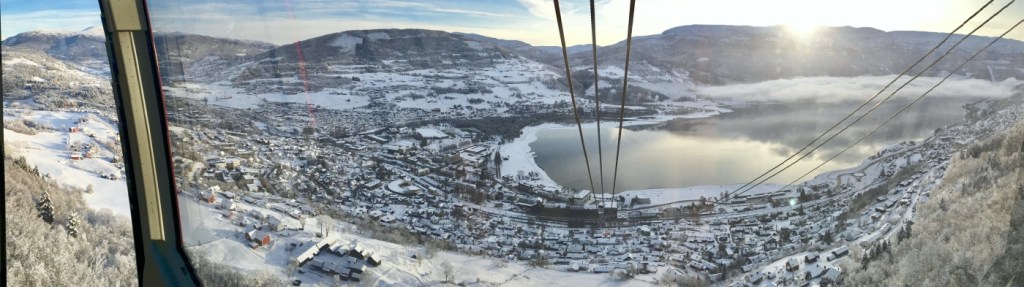 Voss sees itself as the “Adrenalin Capital”, the “Activity Town” or the “Extreme Sports Capital” of Norway. The image below is of Voss from up on the neighbouring mountainside, taken from a Gondola coming down from a snowy peak in winter-time. If you would like to skydive, fly in a wind tunnel, raft, mountain bike or Kayak, Voss is your destination.
