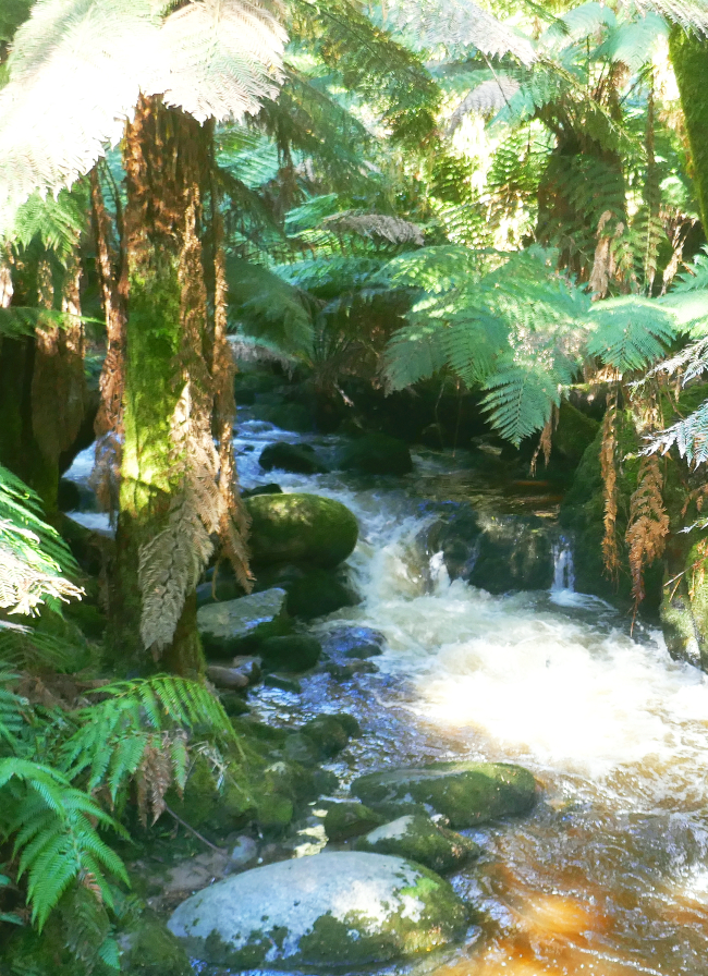 Our journey on this seventh day of our time in Tasmania was around 160 Kms from St Helens to Launceston. There were various places on our list to check out along the way but the first stop, Halls Falls, was a completely impromptu one; we had only been driving for 20 minutes. This area was significant in the history of St Helens as tin was discovered here in 1870 and became part of a significant industry in the coastal town. Georges Bay was a great place for exporting tin. The path into the water-fall has not been labelled one of Tasmania’s great short walks. It is definitely a beautiful short walk but I suspect the quality of the track has meant it hasn’t made the cut for the top 60