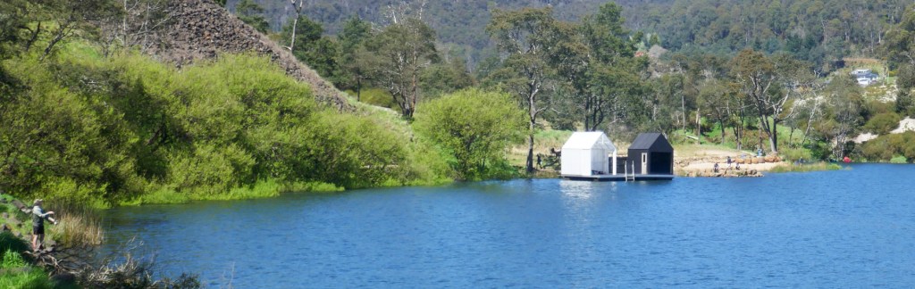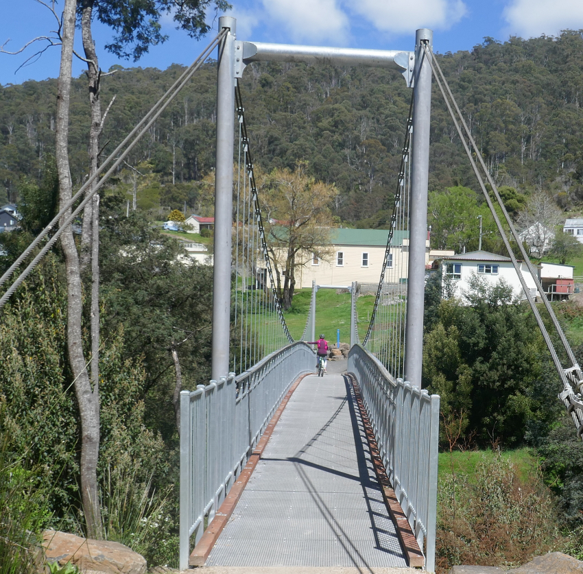 In 2015 a network of Mountain Bike Trails was opened in the hills around Derby and it was the promotion of this aspect of the town that we had seen on news reports and so decided to check it out. The main street of the town is situated on the side of a hill with views over the valley. We were able to get ourselves coffee and cake and bask in the sunshine as we figured out what sort of bike-ride we would engage in. Being a little beyond the mountain biking possibilities, we decided we would hire bikes and go for a ride around the lake below the town, Lake Derby. This isn’t the lake that burst in 1929 which is further up in the hills above the town (Cascade Dam). The best I could gather was some of the original mine workings were under this lake. This lake bike trail is accessed by riding down hill to the suspension bridge over the Ringarooma River.