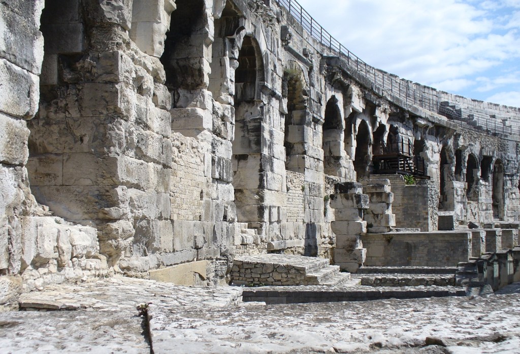 The Romans invaded Gaul in the second century BCE and the Roman Road, Via Domitia, was built through the region. Nimes became a Roman colony before 28 BCE and went on to become one of the most Roman cities outside Italy. This may have been helped by the fact that Julius Caesar’s veterans were offered land around Nimes to cultivate. The Emperor Augustus began a building program that would have encouraged the development of the city. The Roman Empire has left behind around 400 amphitheatres that are still in existence in the world today, in varying degrees of preservation. As we discovered in our stroll around this structure, the amphitheatre in Nime is one of the best preserved Roman arenas in the world. It has survived the last 2000 turbulent years of often destructive history in southern France but managed to survive largely intact…as well being almost continuously in use, not just for entertainment spectacles but as a town administration centre for centuries. Today it is still a place of entertainment, particularly pop concerts. While we were there, the posters of the two annual bullfights were very visible.