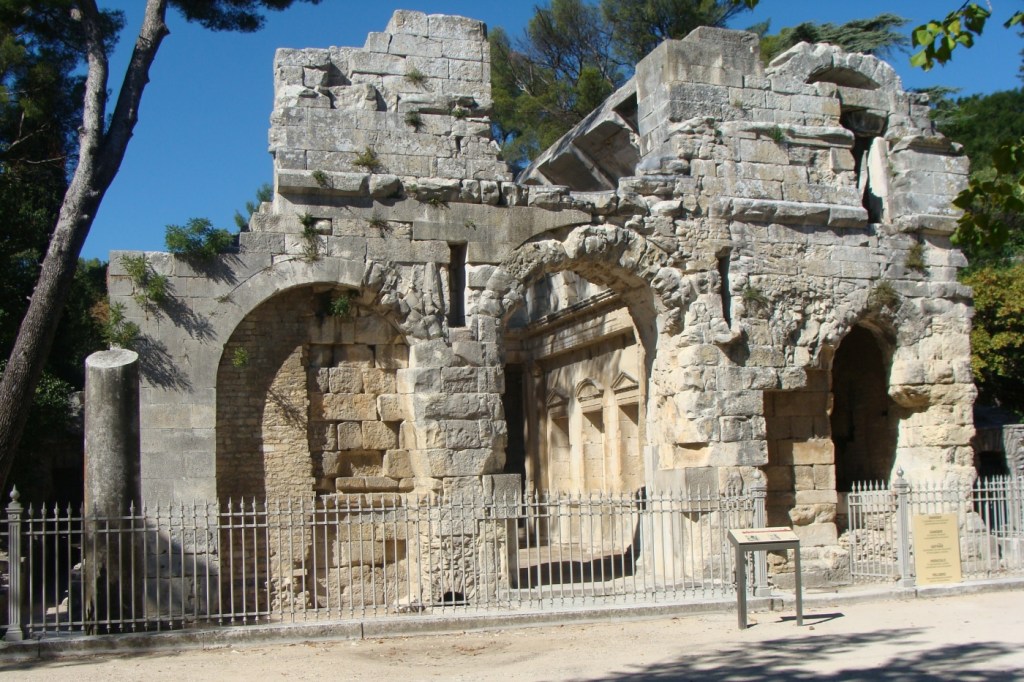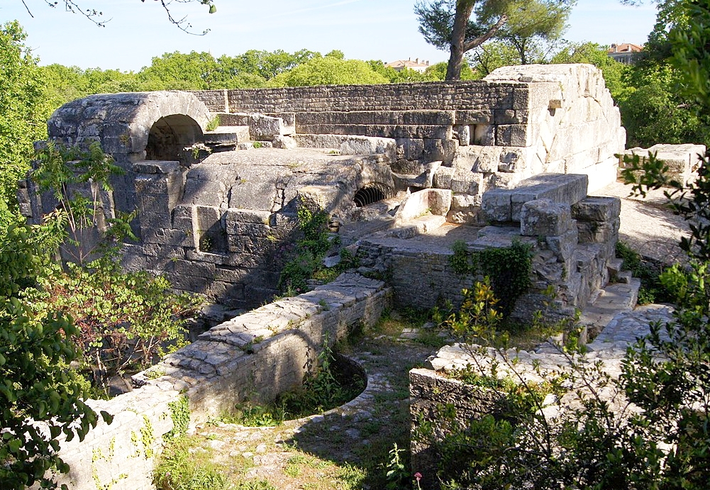 From the Roman Temple, we headed down Rue G.Boissier to the pathways that ran along the Les Quais_de la Fontaine, the end point of a system of canals built by the Romans that brought water from the mountains to Nimes. It is part of the system of waterways that includes the Pont du Gard. The neighbouring gardens, the Jardins de la Fontaine, were built around the original spring that attracted the Neolithic settlers to this area. These beautiful gardens were first laid out between 1738-55 and were built around the ruins of the original Roman baths of the area. The Jardins de la Fontaine are the oldest civic gardens in France. One of the discoveries brought to light during the excavation work involved in the construction of the gardens was the Roman building called the ‘Temple of Diana’. Rather than a temple, it was an Augusteum, a building devoted to the cult of Augustus and his family.