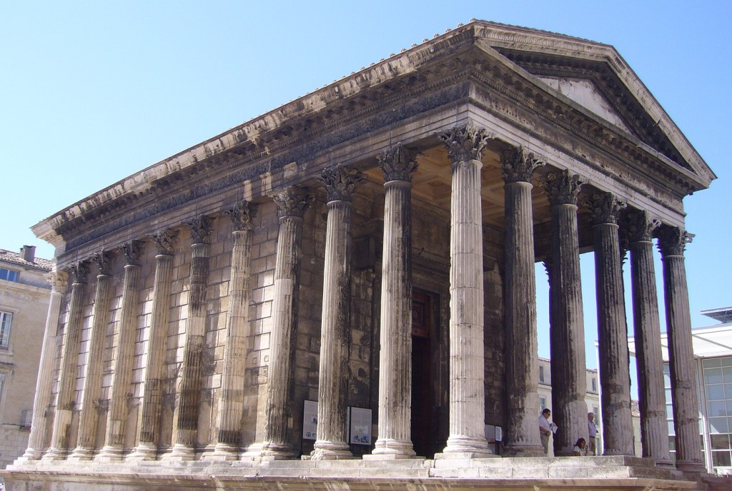 As can be seen on the map of Nimes below, we strolled down the Boulevard Victor Hugo to the next major site in Nimes, the Maison Carree (“Square House”) which is a Roman Temple built around 3 BCE. It was dedicated to the grandsons of Augustus Caesar (sons of the famous Roman General, Agrippa) who had died young. When Thomas Jefferson represented the new United States government in France, he made a plaster copy of this temple and used it to design the new Virginia State Capitol.