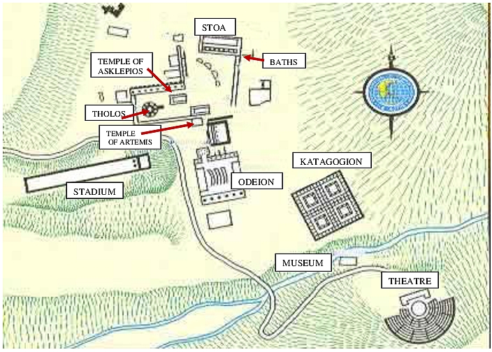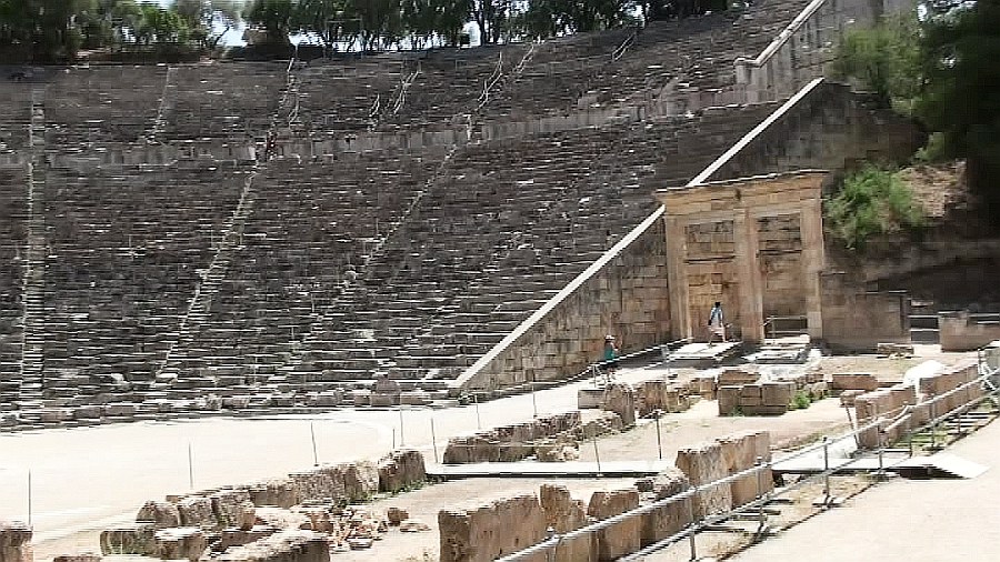 The layout of the site of Epidaurus shows that it generally contained the same type of buildings that were present at Pergamon. The theatre, built at the end of the 4th century BCE is at a distance from the main centre of the Asclepion. We know it was still in good shape in the second century as we have the writings of a traveller of the time, Pausanias (110-180CE), who wrote a description of Epidaurus and the theatre. He informs us of the architect of the theatre, Polykleitos, who also built the complex Tholos structure that stood in the courtyard in front of the Temple of Asclepios. The theatre was excavated in 1881. The local administrators of the sanctuary kept very careful accounts, recorded in stone on the site so we know that the theatre wasn’t the most expensive building in Epidaurus; that was the Tholos. The theatre apparently cost 10 ‘talents’, around about the equivalent of 60000 British Pounds.