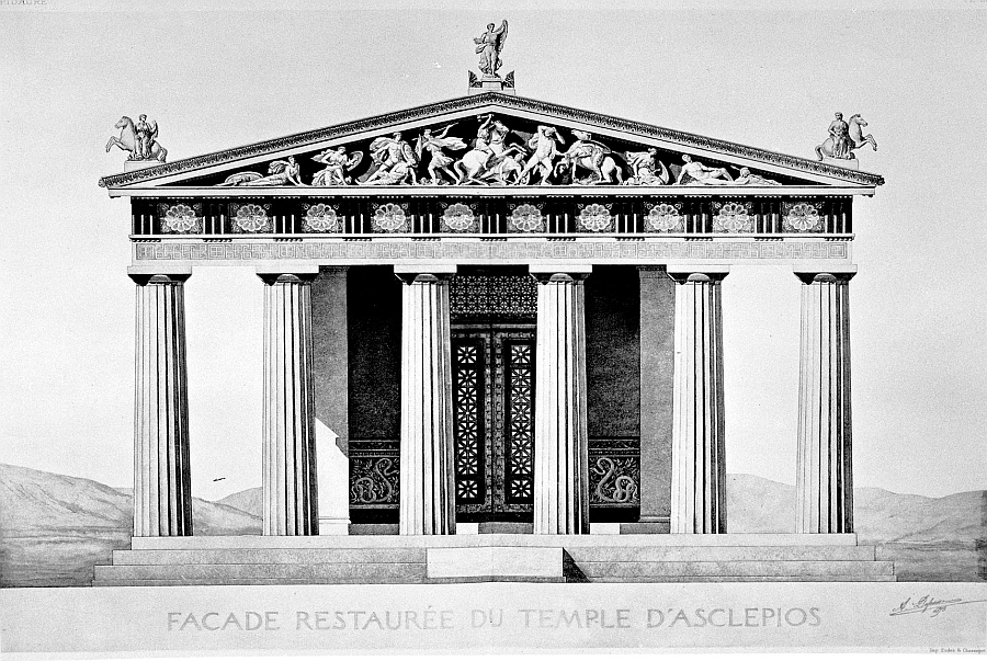 More evidence of what the Temple of Asclepios looked like as well as the God’s statue inside came in the late 19th century with the work of a French architect visiting and spending time at Epidaurus. Alfonse DeFrasse (1860-1939) spent some years working in Epidaurus and published an important work on the subject of the Temple of Asclepios. Below are two major drawings from this work. The first image below is DeFrasse’s idea of what the façade of the Temple looked. The second image below is his depiction of the interior of the temple including the altar as well as the ivory and gold statue of the cult figure of Asclepius. DeFrasse worked for many years at the Ecole des Baeux-Arts in Paris and that institution apparently still has his plans for the restoration of the Temple of Asclepius.
