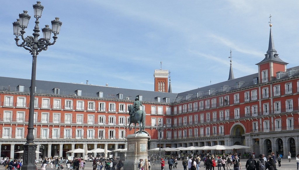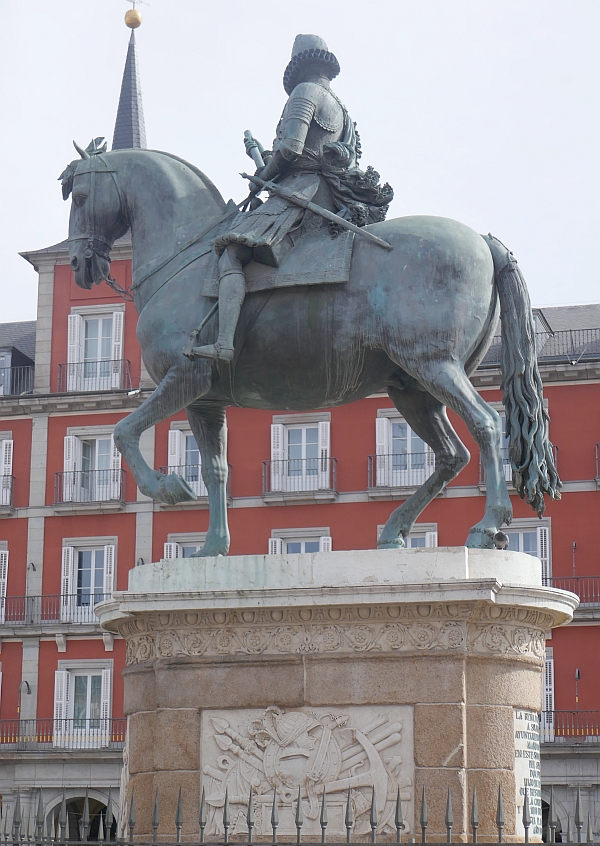 The Plaza Mayor is a huge an extravagant square in what was once the old centre of Madrid in the 16th and 17 the centuries. This was during the reign of Philip III (1578-1621) whose long reign coincided with Spain’s development of huge wealth and empire . In the image below can be seen the equestrian statue of Philip III towards the centre of the square.