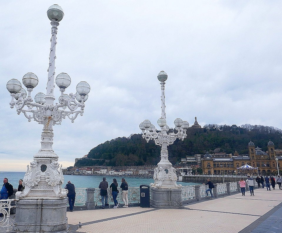 Both bridges and boardwalks in San Sebastian were beautified by the handsome street-lamp posts. Below left is one example of these significant decorations that accompanied many of the walks in this city. To the right below, the photo shows is one end of the San Sebastian city hall that sits not far from the end of the beach. It was surrounded by some very impressive parklands.