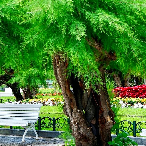 The park pictured in the image to the right above was just across from the Town Hall building with spring flowers in bloom. At the front of the photo can be seen the trunks of bushes that have been heavily pruned. The city is clearly proud of these bushes in their summer foliage, so much so that they put up an Information board to explain them…The “Tamarax Pentandra” was first introduced in San Sebastian in the year 1885 due to its suitability to “La Concha” Bay area and its resistance to sea winds. The Tamarix set forms a very singular historical garden of great beauty that has become a true icon of the city. (The image to the right is the bush in seasonal foliage.)