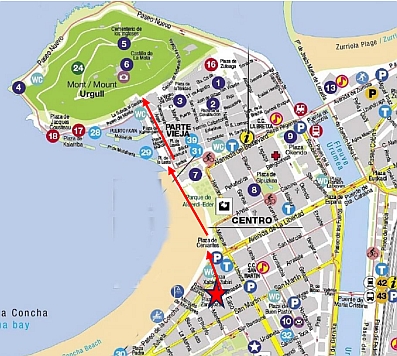 As was our usual practice, we very quickly settled into our rooms and our group of five then set out to for the city’s beachfront. The direction of our walk can be seen on the map to the right. Curiously the first thing that stood out when we arrived at the beach boardwalk was a very large black gorilla that was waving to passerbyes, urging them to get their photo taken with him. I think the tourist business-men of Spain had decided that Gorilla photos were the new thing to exttract money from the passing tourists as we met up with numbers of them as we travelled along the north of Spain and then down to Madrid. Luckily, we escaped the clutches of the unphotogenic gorilla and kept walking down to the end of the beach where there was a significant administrative centre of San Sebastian.