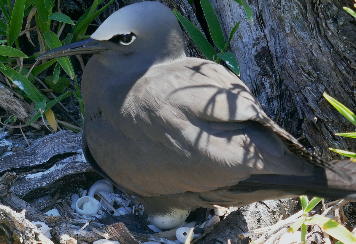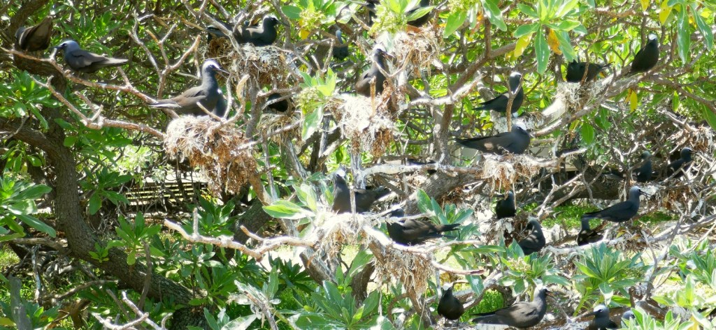 If you arrive on Lady Elliot Island in October as we did on our first trip there, you will be overwhelmed by the huge numbers of Noddys that have taken over the grounds around the Eco Resort buildings. There are at least two species of Noddys on LEI. The White-faced Noddy is the larger of the two similar looking sea birds and is the one most commonly found in nesting places around the resort’s buildings. This ‘Common Noddy’ builds its nests either in the Octopus Bushes or on the ground like so many seabirds do on Coral Cays as there are no predators. They spend much of their year at sea but we also noticed that on a July visit, a lot of Common Noddys were returning to their Octopus Bushes on the island after sunset and then heading out to sea again at dawn.