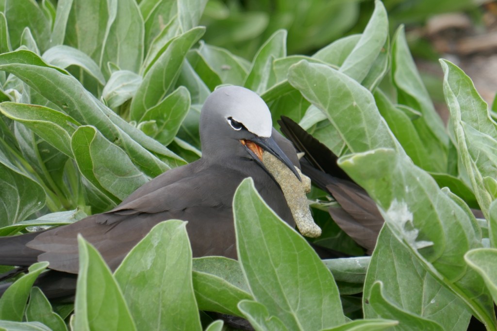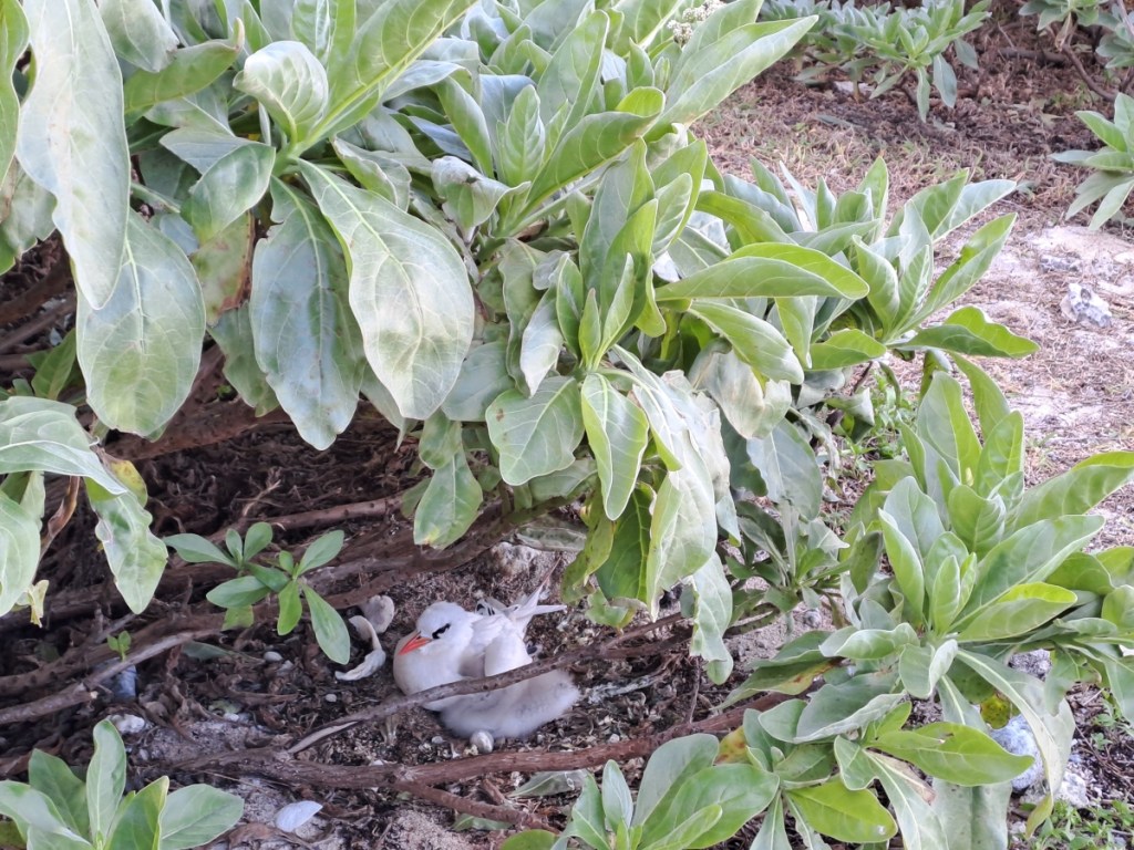 The shrubs that the Common Noddys nest in or under, the Octopus Bush (Heliotropium arboretum ), are also very interesting plants. They are native to tropical Asia, Northern Australia and the Pacific Islands and general grow in the littoral zones of islands, those areas closest to the shore but above the high-water line. One of the curiosities of seabirds living in an almost continuous salty environment is the question of where do they get their fresh water from? One method of resolving this important question can be found in the Octopus Bush. Almost every branch of the Octopus Bush has a sacrificial leaf at the end of a branch where any absorbed salt is channelled. This leaf turns yellow and eventually falls off. (The photo on the right shows a Red Tailed Tropic bird under an Octopus Bush and the yellowing leaves can be seen in the image with close inspection.) This process enables the rest of the bush to be salt free and these leaves can thus be eaten by both the Noddys and humans!