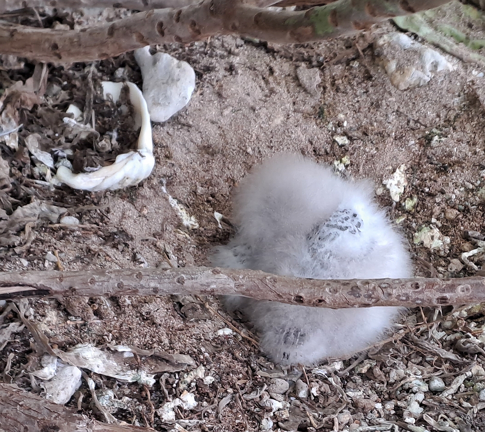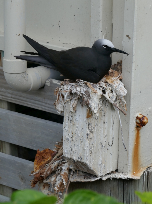 But it seems there are social classes amongst the Common Noddys. There are not enough desirable forks in the Octopus Bushes on the island so many couples have to accept less attractive places to nest, the last resort being on the ground. A good example of this is the mother (below right) standing over her newly hatched egg in her ‘nest’ of bits of bark and coral stones on the ground. The bird on the left is clearly very proud of her apartment-nest built on a piece of wood jutting out from one of the resort buildings.
