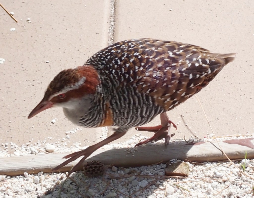 All new arrivals on the island are given a welcome tour of the facilities and perhaps the first place a visitor meets the ‘Rail’ is in the dining hall. The Buff-banded rail has colonised all open areas of the island whether they be lawn, beach or dining hall. Some of them, presumably remembering their ancestors, also live in the long grass beside the runway. However the ones that congregate around the dining room illustrate their extreme behaviour by sitting beside the sliding door and sneaking in when the door opens; there is one supreme rail who owns the dining room and he/she not only scours for the crumbs on the floor but chases away any other Rail that tries to sneak into this much valued room; thus their other name, the ‘Buffet-Bandit Rail’.