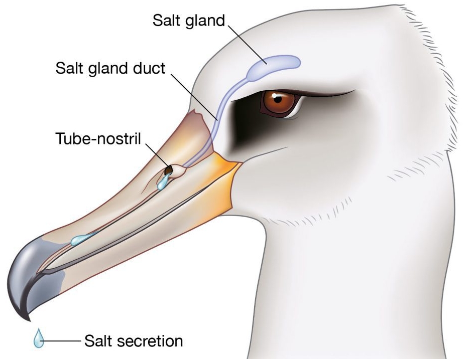 For any seabird like the Noddys to survive for days, weeks and months at sea, they also need a solution to the fresh-water problem. The answer is that all seabirds have a pair of glands which, like our kidneys, draw salt ions out of their blood stream. The image to the left gives a simple illustration of this process. This allows the Noddys to drink the water they live on. Birds like seagulls, Terns, Petrels, Albatrosses, Penguins, Pelicans and Geese all share these same life-preserving glands.