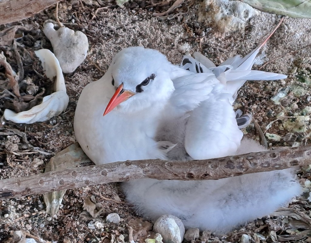 Perhaps the most impressive looking birds that we have seen nesting under the Octopus bushes of Lady Elliot Island are the Red-Tailed Tropic Birds. They are a species of bird that are found in the tropical areas of both the Indian and Pacific Oceans. The famous British Naturalist on James Cooks voyages from 1769, Joseph Banks, encountered and recorded this bird on his travels in the Pacific. Each time we have visited Lady Elliot Island there have been pairs of Red Tailed Tropic Birds nesting under the Octopus Bushes. These birds make the Common Noddy look house-proud as they merely scrape an indentation under the bushes and produce their one egg. Egg incubation takes about 6 weeks and the parents take turns in nesting with the chick once it is born. These birds don’t always appear to enjoy their chick-raising duties as the two photos below illustrate. I visited the nesting bird (shown to the right) one morning with the chick snug by his/her side. Two days later I returned and the responsible parent had moved to a separate hole under the bush, some distance from the ball of fluff that was the offspring.