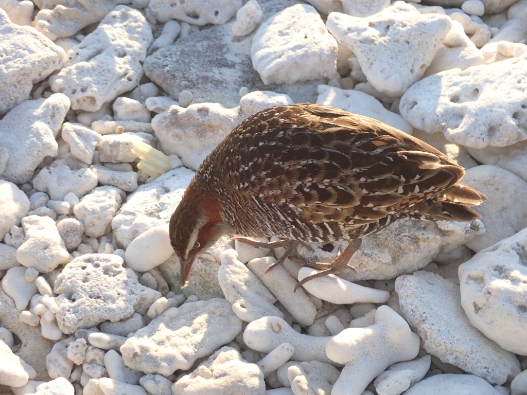 I only saw the Rails flying on my third visit to the Island and I was walking to the ‘Coral Gardens’ along the edge of the runway. Apparently we were a bit too noisy and walking too close to their nests in the long grass. Suddernly three or four of these birds flew out of the grass in alarm and flew 5 or 6 yards away. This puzzled me as a noise that is a hundred times louder than walking humans, ie. landing planes, appears not to be of great concern to them. Lacking in protective wisdom, the Rails have divided up the grass runway and only appear to hear or see the landing planes when these gigantic sky-beasts are upon them. Unlucky Rails who have claimed territory in the centre of the runway are most at risk of being run over; they appear only to decide to jump out of the way at the very last second and many leave it too late. The death of ‘Runway-Rails’ doesn’t appear to be a big issue for their surviving Rail neighbours. These unfeeling locals don’t rush over and stand over the body of their unlucky fellow Rail and keen their sorrow; after they have wandered across and inspected the damage, they then proceed to eat their fellow Rail as a free nutritious meal is never to be ignored. To my shock and horror, these Buff-banded Rails are cannibals!