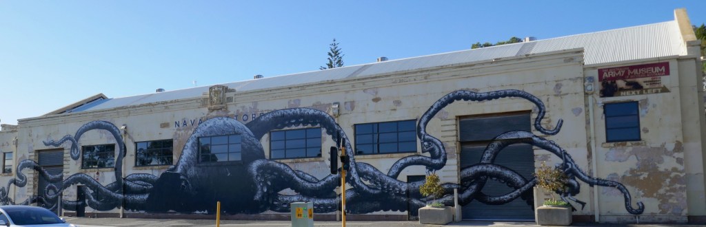 We were staying near Joondalup, a northern Suburb of Perth, for the night before we headed south to the Margaret River region of Western Australia. Rather than travelling by the main freeways, we decided we would take the coast road to Freemantle. It was an easy route and although the cars around us were on their way to work in Perth city, we had no trouble enjoying the drive and the views so it wasn’t long before we were entering Freemantle. This coastal city has the most curious mural to greet travellers of any I have ever seen before. It covers the entire wall of the Army Museum that sits on the bank of the Swan River just as you cross the last bridge before entering the centre of Freemantle. I am not sure if this giant blue squid is a threatening symbol of the military might of Freemantle but whatever its meaning, it was an impressive greeting to travellers.