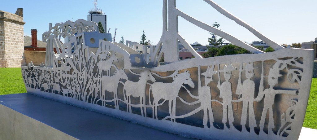 Freemantle is at the mouth of the Swan River and so it is no surprise that this busy port has a long history of trading in all the important products that were being demanded by the new colony up river, particularly from the whale industry that provided many of the modern conveniences that the local citizens were demanding. (Oil for lamps, whale bones for corsets!) In the park next to the Roundhouse was a great art piece celebrating this maritime history.