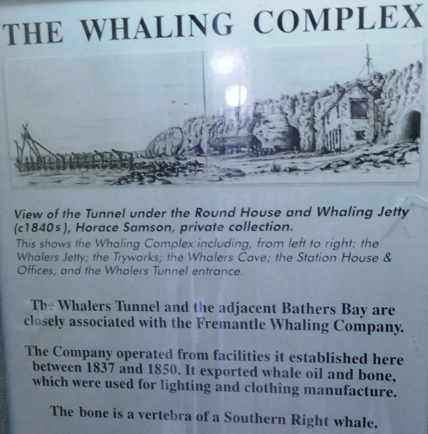 After walking through the garden on the ‘foundation walls’ that ran along the back of Bathers Bay, we found a set of stairs that took us down from these heights to where there was a bike track and a footpath that ran along the other side of this raised area. We were able to stroll back along the high foundations of the Roundhouse that led us to the tunnel that had been drilled by whalers underneath the old prison so they could conveniently transport their wares through to the centre of the city. No whaling or other seaborn goods are carted through the tunnel these days; it is a short cut for locals and a very interesting pathway for tourists. The tunnel exit can be seen in both images of the Roundhouse earlier in this article. Along the tunnel in the niches carved into its walls, there are interesting stories presented about the area’s history, such as the one shown in the image on the right below of the ‘Whaling Complex’.