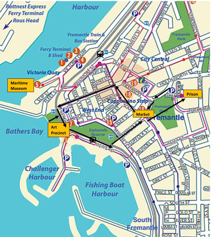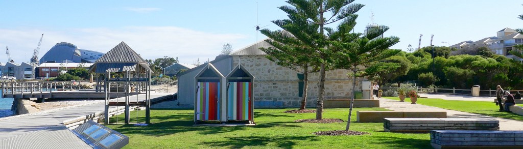 I have sketched out our tour of the centre of Fremantle with black arrows on the map below. It is a very attractive shopping precinct but I was surprised that they called the area we were strolling through the ‘Cappuccino Strip’. I can only presume that the city fathers were trying to distinguish their Cappuccino coffee drinkers from the ‘inner city latte sippers’ that often draw the ire of rural voters. We were heading towards the foreshore of Freemantle that the city is so famous for. We emerged from the shopping precinct in line with an area of the coast line that is full of Freemantle history and local attractions, particularly the walking tracks and bikeways that are adorned with great public art. In fact the old buildings in front of Bathers Beach have been dubbed the ‘Art Precinct’.