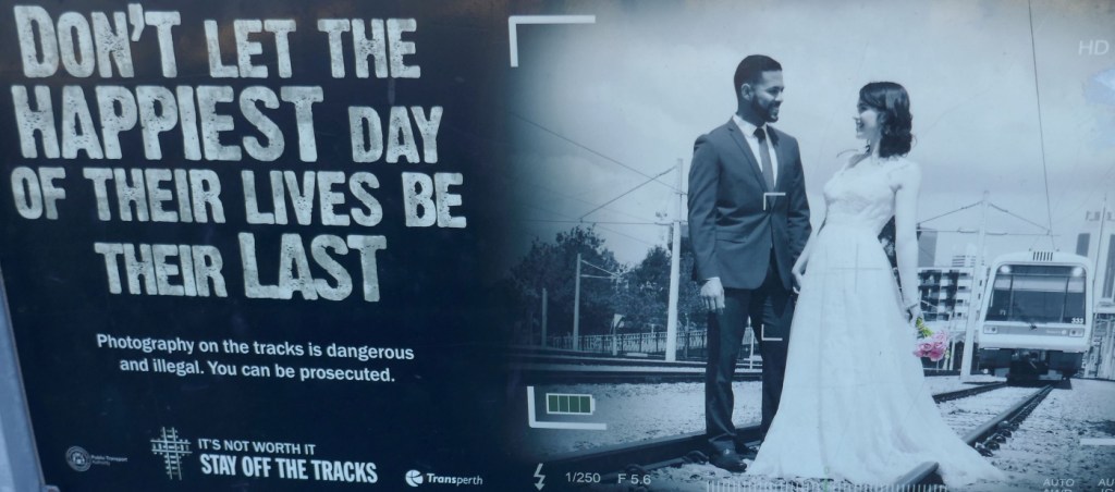 I noticed as we wandered along the street at the back of Fremantle’s foreshore that we had to cross and re-cross a railway line. Each time we crossed, we had to pass through carefully constructed gateways that ensured that sensible folk could cross the railway line safely. However at each of these crossings there was a warning poster that showed that less than sensible people ran the risk of being hit by trains as they got their cute wedding photos taken on the actual railway line. My only thought (being a highly safety conscious person) was “Who would do such a thing…surely this is a made up story?”