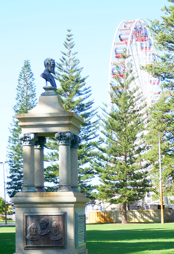 The Esplanade Reserve is a lovely place for family weekend picnics with the bonus of a giant Ferris Wheel to entertain everyone. The more serious minded amongst the picnickers who couldn’t face a ride in the big wheel, could wander over and have a close inspection of the Maitland Brown Memorial monument. The Monument is usually called the Explorers Monument and has been accused of presenting a one-sided history of the early exploration of Western Australia. The monument has plaques to three explorers who were killed by Aboriginals in 1864 when their party was exploring the Kimberleys. In 1994, an attempt was made to redress the perceived bias of the monument so another plaque was added to the base to present this view, the text of which is below.