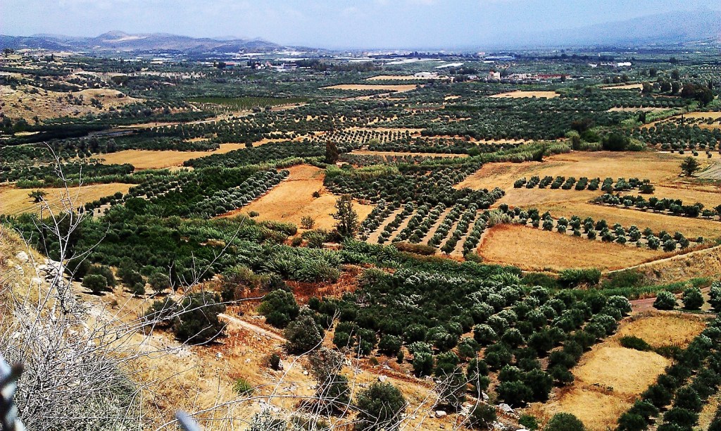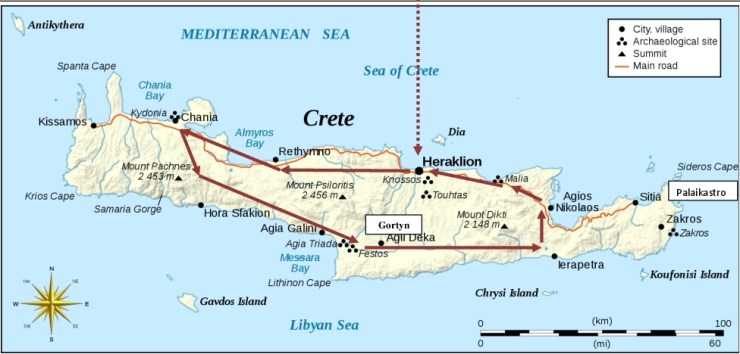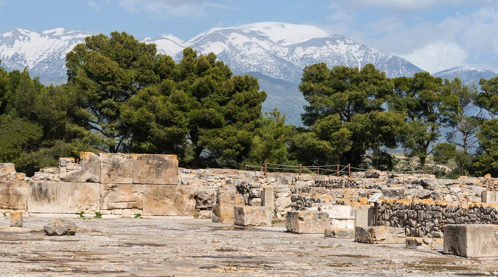 We left Chania reasonably early in the day and headed off on our long drive down the length of Crete to our next night’s stop at Agios Nikolaos. Our morning drive was up hill most of the way with our intended first stop being the site of the ancient palace community at Phaistos. Part of the issue of driving through Crete is understanding that the landscape has been imbued with human stories for many millennia. For example, we passed the tallest mountain in Crete on our left (See above map…Mount Psiloritis), its common name is Mount Ida. In ancient myths, the mountain was sacred to the Goddess Rhea and it was here she gave birth to her baby, Zeus, in a cave. He had to be hidden as his father Cronus was looking for his offspring to kill him off.