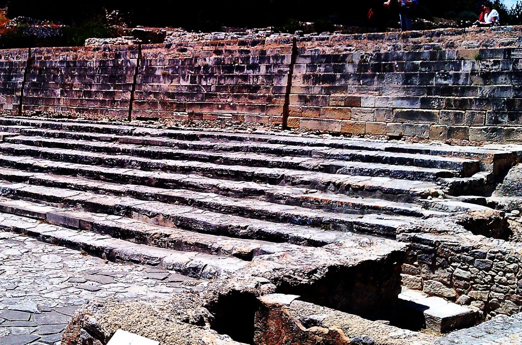 Visiting the ruins of Phaistos’s Minoan Palace is a challenging exercise if your plan is to come away with a clear view of the nature and layout of the palace. While it is awkward to look for the interpretative rebuilding that Sir Arthur Evans used at the Knossos Palace, every now and then I was wishing for some of the same while walking around Phaistos to give me a stronger sense of what I was actually looking at. The developers of the site have done a good job with the plaques with diagrams and archaeological notes that are placed regularly around the site. However they are often small line drawings that don’t create the shock and awe that the original would have caused for strangers arriving at this amazing palace overlooking the Messara Plains. The image on the right is a suggested view of the palace from the west side. The steps to the theatre area can be seen on the left of the image as well as the steps up to the main entryway that led visitors to the central court.