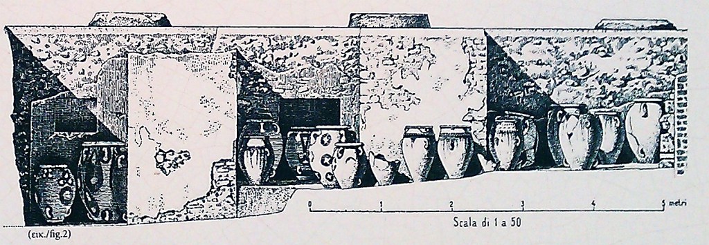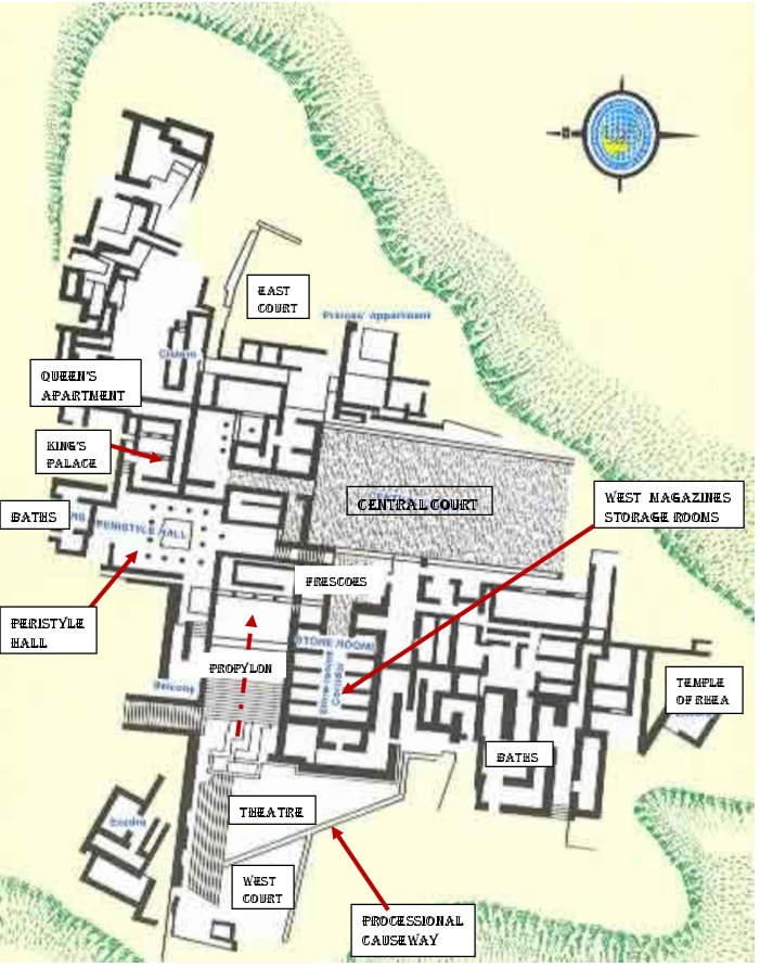 From the west side of the Central Court there are two rectangular rooms that appear to be sitting rooms for spectators to watch events taking place in the open courtyard. As the map of the palace earlier in this article indicates, there are storage magazines on this western side of the palace where food supplies were stored in large clay jars (Pithoi). It was in this area that the ‘Archive Room’ of the Old Palace (1900-1700) was discovered containing 6000 clay sealings which were used to monitor the movement of the goods in these storage areas. The diagram below from the site shows a well-preserved Old Palace magazine under the floor of the lightwell in the Propylaea