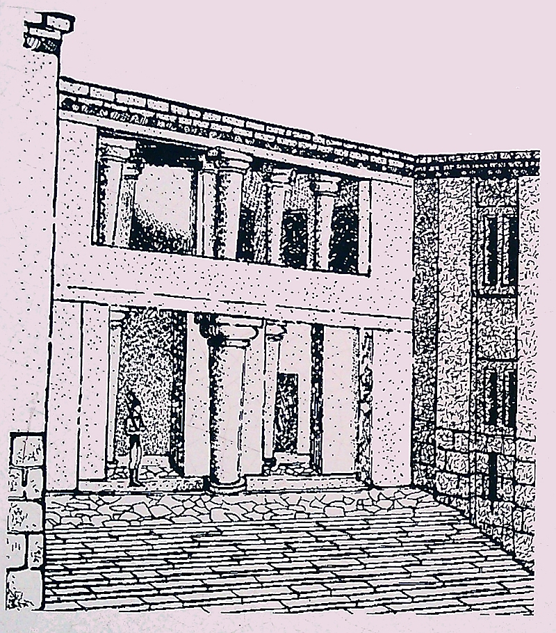 Not far from the main entrance, the visitor moved into the roofless court-yard where they had the choice (if they were royalty) of entering the royal apartments by turning left or heading the other way towards the Central Court. The associated plaque today reads… “The open peristyle court was one of the most elegant inner courtyards of the New Palace. It consisted of an impressive peristyle with four columns on each side supporting the corresponding colonnades, while the central area remained open. The same construction appears to have continued on the upper floor, with a second row of columns.”