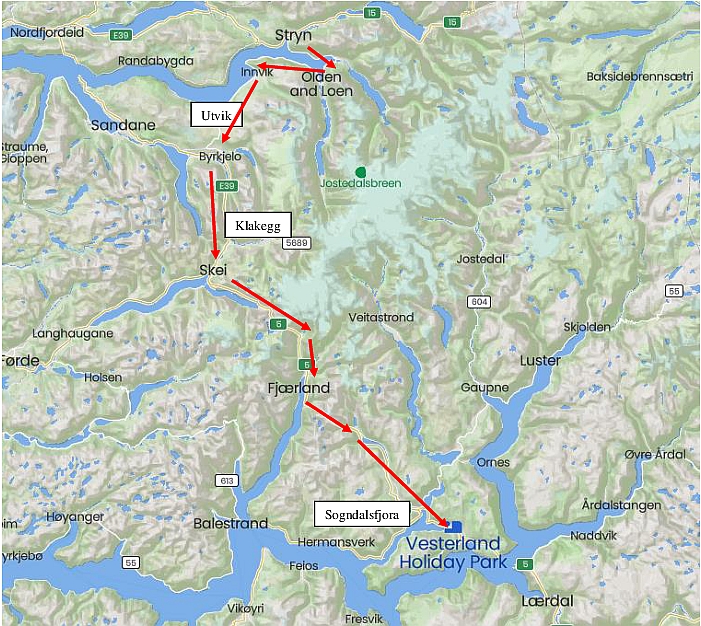 Our trip today was the second last day of our journey from Trondheim to Bergen. Today’s leg was taking us from Stryn to the Vesterland Holiday Park which was about two and a half hours away. Our first stretch was to get around the end of the Innvik Fjord and then head south through mountain and fjord country. The image on the right below shows we had a couple of incidents of goats escaping on to the road but luckily no damage to car or goats.