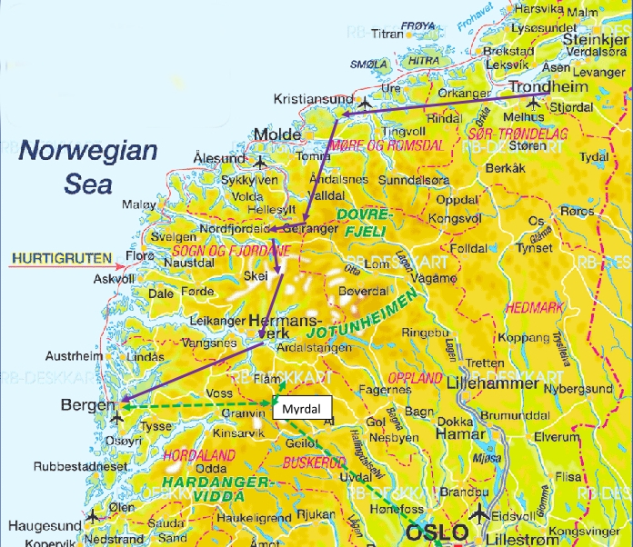 We had travelled all the way from Bergen to Tromso by Hurtigruten boat and then flew back to Trondheim to spend two days there. After our time in Trondheim, we caught the bus back to the airport where the car hire companies were located and picked up our means of transport for the next four days. We drove around the outskirts of Trondheim on our way south, heading for a guest house on the coast not far from the small town of Sveggen. The internet had suggested that our drive would take us around four hours. After a one night stay here, we would then continue on at a leisurely pace for 3 more days to return our hire car to Bergen Railway station.