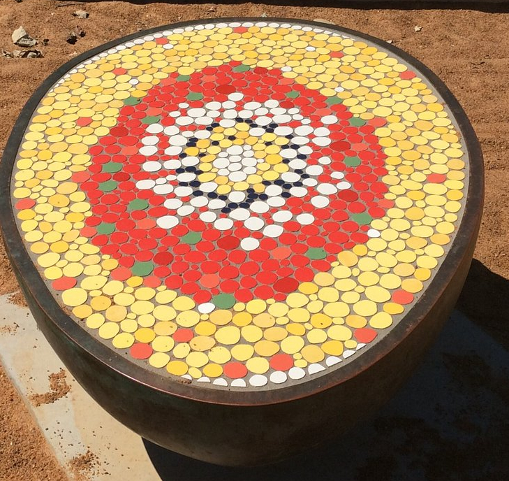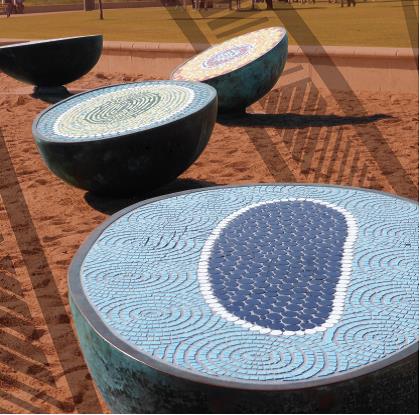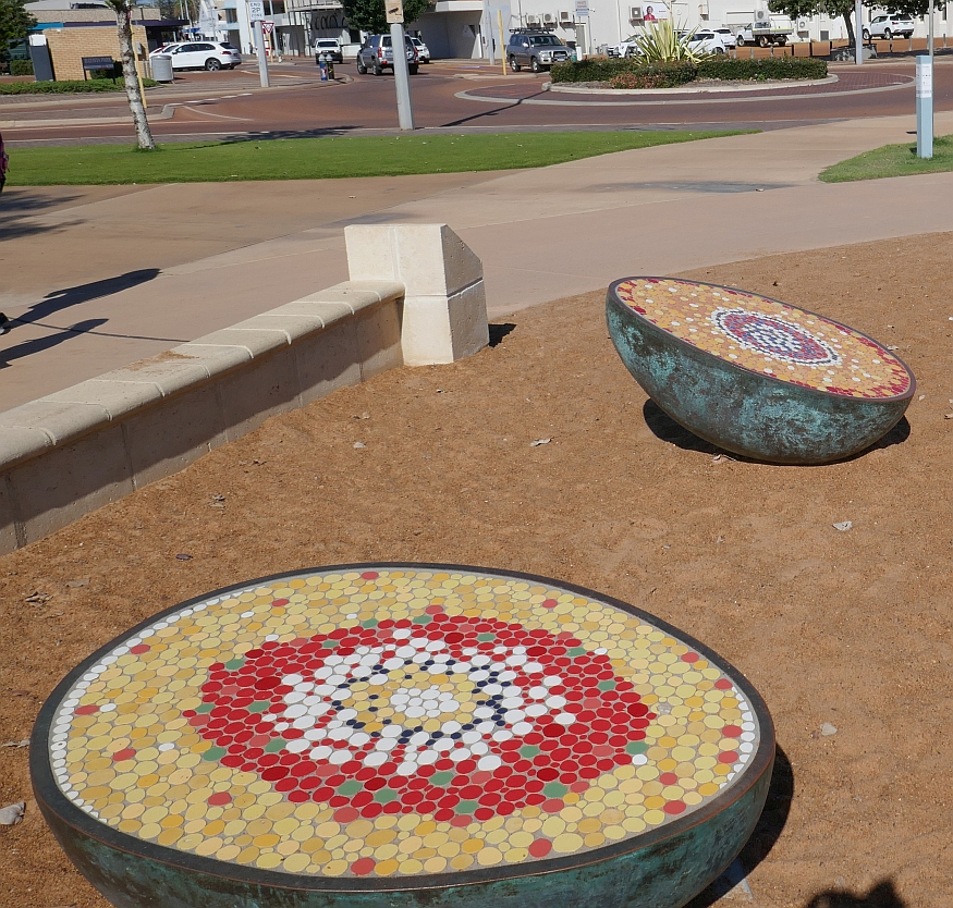On the diagonally opposite corner of Foreshore Drive there is installation that is commemorating more contemporary issues than the Batavia Wreck. In the last twenty years in many parts of Australia there is a growing understanding that indigenous people have been handing down many stories about their understanding of the stars and the night sky and professional astronomers are starting to take notice. In Western Australia in 2009 there was a gathering of First People elders and artists with astronomers for a cultural exchange. This took place at Boolardy Station in the Murchison and became the basis of what was called the Ilgarijiri Project. This exchange has continued and resulted in the financing of this project on the Geraldton foreshore of indigenous art works inspired by the sharing of ideas and stories of indigenous astronomy. Inspired by the paintings of Margaret Whitehurst (The Emu in the Sky) and Barbara Merrit (The Seven Sisters and the Hunter), there are 8 halves of emu eggs made from copper and mosaic tiles scattered in this Geraldton Park. It is seen as a culmination of the coming together of Art and Science.
