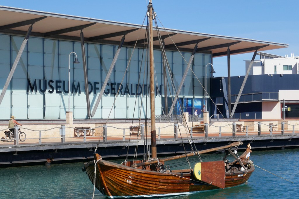 From the Ilgarijiri Emu eggs we strolled down the foreshore for a couple of blocks to the Geraldton Museum. On the left we passed the Batavia marina and an assemblage of reasonably new apartment blocks that were put up in the new millennium as part of the revitalisation of the Geraldton foreshore. The Museum building was clearly an important centre of this development built in 2000. The redevelopment had involved the removal of the old railway line and in May 2021, there was a large area of empty ground at the back of where the Marina is located, quietly waiting for the future development of this city centre. Parked in the marina to one side of the Museum is a traditional Dutch vessel and is a replica of the longboat used by Francisco Pelsaert and 47 others to sail in 1629 to Jakarta (Batavia). This was a voyage from the Abrolhos Islands of around 1500 nautical miles!
