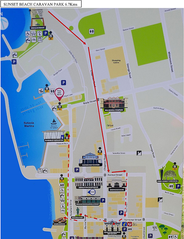 We arrived at the Sunset Beach Caravan Park in the early afternoon after our trip down from Kalbarri. Geraldton was the biggest urban centre we had visited since leaving Perth a few weeks previously. It is a port city that services the mining, fishing, farming and tourism industries in the broad area of the Mid-Western region of the state. Our holiday park was in an outer suburb of Geraldton at Sunset Beach and our touring destinations were all centred around the heart of Geraldton, 15 minutes south. The map to the right shows the route of our drive and walk around the centre of town. We found a car-park near the Geraldton Art Gallery which also served as a tourist information office so it was a good place to start our exploration. It was also the city’s old Town Hall from 1907 and so it was a local heritage building.