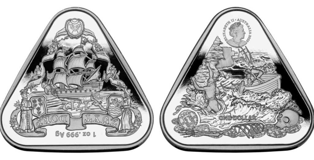 If the puzzle of the Zuytdorp needed to become more iconic, this occurred in 2020 when the Royal Australian Mint produced a silver triangular coin dedicated to the wreck of this Dutch trading ship. One side of the coin shows the Zuytdorp, built in 1701, in its heyday before its departure for the East Indies. The other side of the coin shows its final seaworthy moment before it broke into three pieces on the rocks below the cliffs south of Dirk Hartog Island.