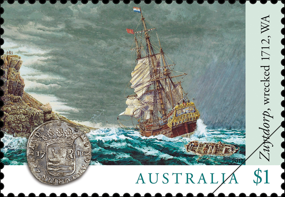 Of the other three Dutch shipwrecks off the west coast of Australia, the main one I was interested in was the Zuytdorp. We encountered the story of the wreck of the Zuytdorp on the cliffs above Kalbarri. The site of the wreck is about 65 Kms north of Kalbarri and it was only officially located in 1964 although artifacts had been discovered both on the top of the Zuytdorp Cliffs and below the cliff edge along the shoreline for many years. One significant piece was a carved console of a female figure that was found in 1925 by Tom Pepper a boundary rider working on the sheep station in the area. An image of a copy of this artifact is found below, currently held in the Visitors Centre in Denham. When the Australian Post Office started printing stamps with an image of the Zuytdorp about to hit the reef at the bottom of coastal cliffs, you know the story is starting to achieve important status. The above stamp produced in 2017 is based on the Dutch-born artist Adriaan De Jong’s painting where he attempted to capture the moment just before it hit the reef; his image is certainly well researched, based on the work of many archaeologists. The silver coin on the stamp acknowledges that there were 248,000 guilders in newly minted coins on board the ship. Up on the headland there appears to be a group of first Australians gazing in wonder down at the inexplicable scene of a monster crashing onto their land.