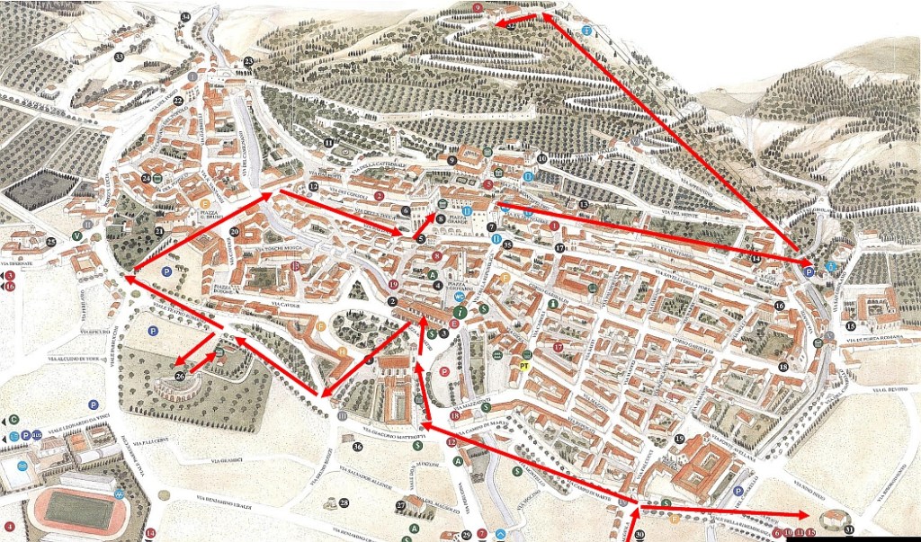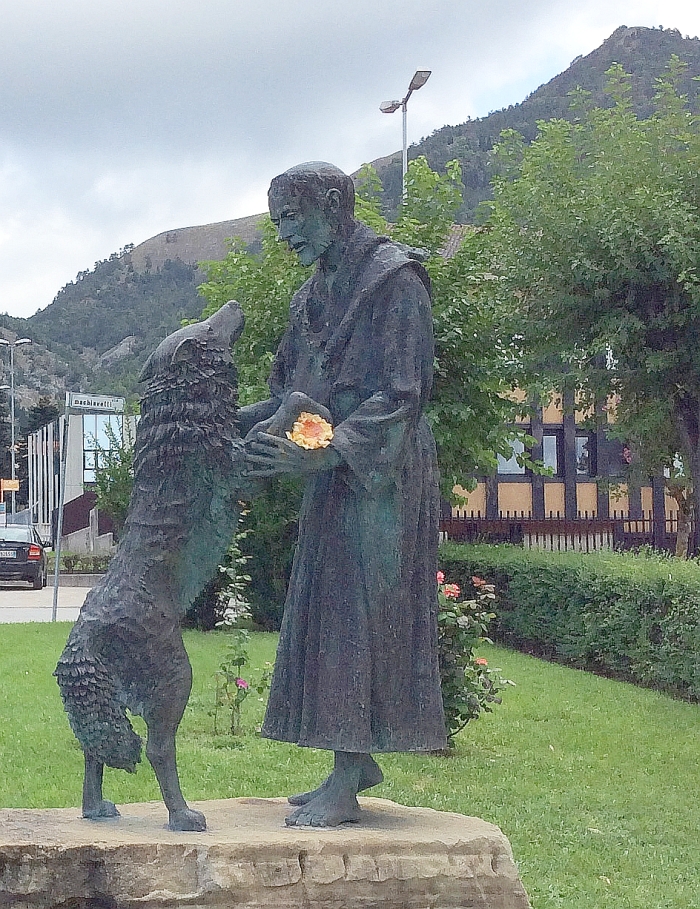 Above is an approximate outline of our 2015 visit to Gubbio after making the 52 kilometre drive from Assisi. Our first stop was at a park on the edge of Gubbio where there was a small church, Chiesa della Vittorina. It was built in the 9th century to commemorate a victory over the invading Sarcens but was given to the Franciscans in 1213 as the group’s first monastery in Gubbio. This site is also considered to be where Francis met the wolf who had been terrorizing the citizens of the town for many months. There is a large park around this small ancient church and an impressive statue of Francis meeting the wolf.