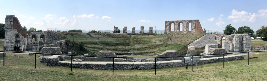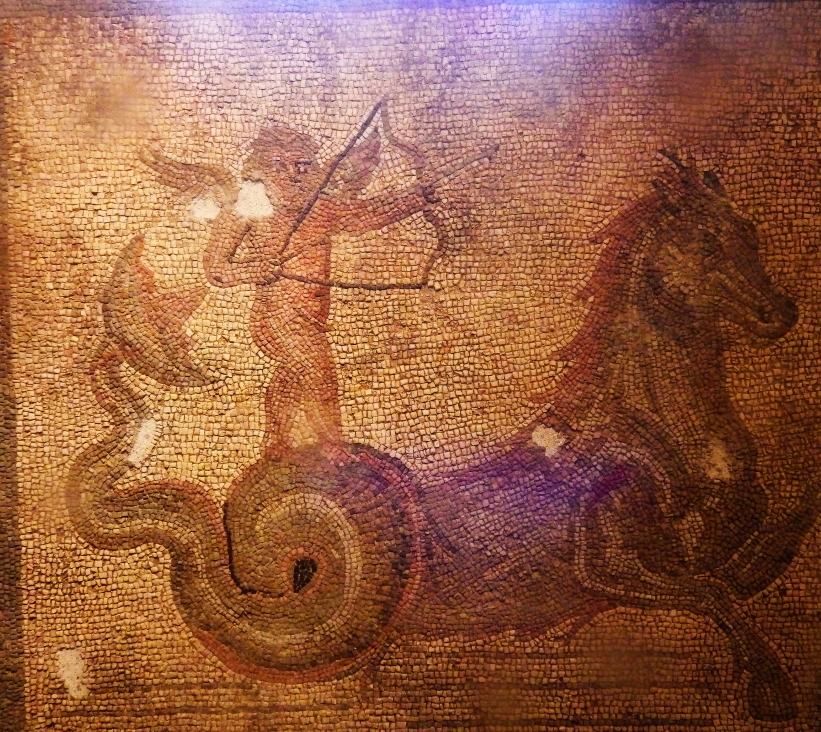 There was a small museum next door to the Roman theatre (an ‘Antiquarium’) which we visited and were surprised at the number of impressive archaeological finds made around the ruins of the theatre. There were quite a few large tile murals on display in the museum that must have once adorned Roman houses built near the theatre.