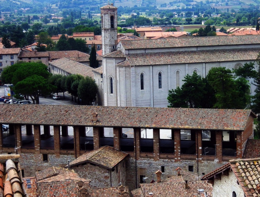 Gubbio is one of the many beautiful towns in Umbria in the centre of Italy. Like so many of the other cities of the region, its central area still consists of mainly medieval buildings as it sits on an ancient site of humanity on the slope of Mount Inginio. People have been living on the slopes of the Appennine mountains since the bronze age (3000-1200 BCE). There was a town here called Ikuvium before the conquering Romans arrived; a set of bronze tablets was uncovered in Gubbio in the 15th century that contains the largest surviving text of the original Umbrian Language. It also has extensive ruins of a Roman theatre on the edge of town dating from around the first century BCE, said to be the second largest theatre surviving in Europe. Gubbio became a powerful and wealthy town during the Middle Ages and its citizens were involved in the crusades and the 12/13th century conflict between the Guelphs and Ghibelines factions that quarrelled over power in Northern Italy.