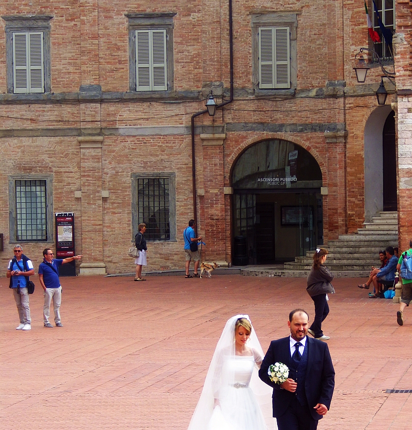 By referring back to the map of our tour around Gubbio at the start of this blog, it shows that when we left the Roman Museum we drove up to the northern side of town, found a park and then proceeded on foot for the rest of our tour of Gubbio. This section of town is where the significant administrative buildings of the town are located and a number have served this purpose since the middle Ages (See image above). The major public square of Gubbio, Plaza Grande, is a huge, paved area set between the Palace of the Consuls on the left and on the right, the Palace of the Podesta. The Palace of the Consuls is a 14th century building that today is a museum which houses the town’s ancient treasure, the Iguvine Tablets, bronze tablets written in the old Umbrian language. Almost a twin palace on the other side of the square, the Palace of the Podesta was referred to in statutes in 1338 but with a long list of work that hadn’t been completed. Some external sections of this building are still unfinished. This ‘palace’ was used as a prison up until the 19th century and today houses the municipal administration of Gubbio. On the day we strolled around the Plaza Grande, we were surprised to see a bridal couple arriving in the square for their wedding photos.