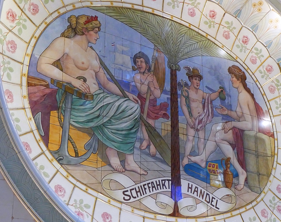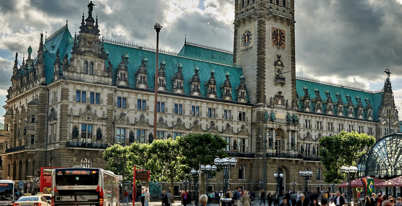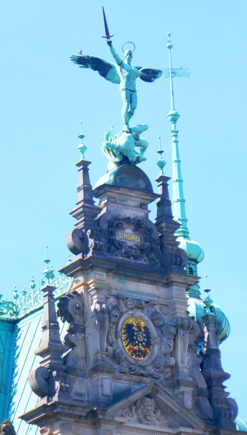By the time we finished our thorough exploration of St Nikolai’s Church, it was well and truly time for lunch. We were in the central district of Altstadt, and so we were not likely to find a café similar to the cafes of the suburbs of Brisbane. We certainly found a place that was happy to serve us a sit-down lunch but the tiled ceiling of the restaurant was a give-away that we were moving in circles that we weren’t used to. We survived the experience with our pride still intact and we were able to continue our slow inspection of the centre of Hamburg. We were just over the road from the city’s Rathaus, not just the seat of local government but the home of one of the 16 state parliaments of all of Germany