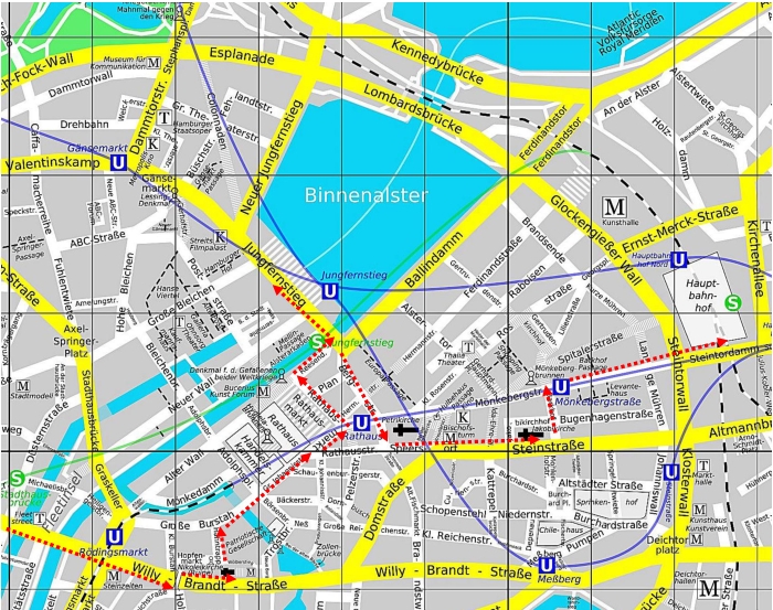 From the Rathaus we strolled over to the roadway that separated the two artificial lakes in the centre of Hamburg, Binnenalster (‘Inner Lake’) and AuBenalster (‘Outer Lake’), fed by the River Alster. The road we were standing on was once on the path of the original defensive walls of Hamburg that were knocked down in the late 19th century. The route of the old walls has been largely replaced by parks that surround much of the left-hand side of the city, all the way to the River Elbe.