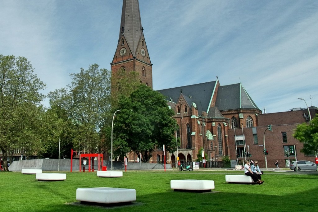 Over on the next city block from St Peter’s Church is a park (Domplatz) that despite its innocuous green space, has a long history of city conflict that goes back to the reformation. In the 12th century, this was where St Mary’s cathedral of the ancient Roman Catholic Archdiocese of Hamburg was built. During the Middle Ages, many Catholic Cathedrals in Europe had an area designated around them as an ‘Immunity District’, an enclave or Cathedral Close that was often surrounded by walls and was ruled by the archbishop. With the arrival of the Reformation, it was converted to a Lutheran Church and by the start of the 19th century, the immunity enclave was seized by the city and the church was ordered to be demolished by the local government. It still remains a city park and has not been redeveloped due to continuing community conflict over what should be built here.