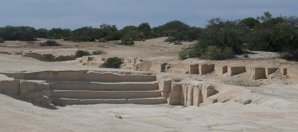 From the Telegraph Station we followed the vague signs that led us to the Hamelin Pool section of Shark Bay. Before we reached the water’s edge, we walked through the Shell Quarry where the Cockle shells, like at Shell Beach, had been building up for thousands of years and turning into stone. From around 1900, locals began building their sheds and houses from blocks of compressed shell that were sawn out of this quarry. It is from here that the blocks that made up the Old Pearler Restaurant in Denham were sourced. If a heritage building is repaired in Shark Bay, the stones will be cut here and transported to the appropriate site. This quarry can only be used to repair heritage buildings, not new ones.