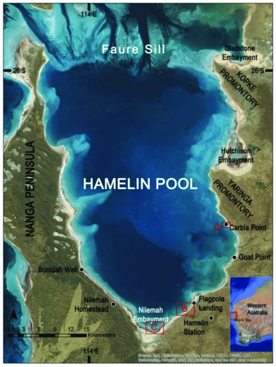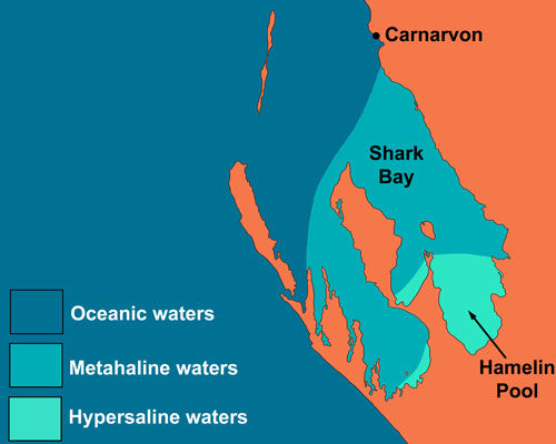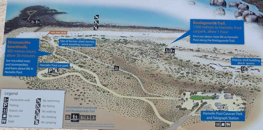We were driving in from the North West Coastal Highway two days before our departure from Denham and we passed a sign on the side of the road that simply said ‘STROMATALITES”. I asked Gayle whether she knew what a stromatalite was and she said she had no idea. I knew I had heard the term before but I couldn’t recall what they were; I suspected they might be a technical term for some cave hanging feature like Stalactites but my only solution was to google the term. Wikipedia gave me the following definition… “Stromatalites are layered sedimentary formations that are created by photosynthetic cyanobateria. These microorganisms produce adhesive compounds that cement sand and other rocky materials to form mineral ‘microbial mats’. In turn, these mats build up layer by layer, growing gradually over time.” (I was not even close, not caves but sea floors!) These ‘sedimentary formations’ sounded interesting so when the next road sign appeared pointing to the Hamelin Pool Caravan Park, I suggested we drop in on our way back from Denham…and so we did. (Map: Courtesy: https://www.sharkbay.org)