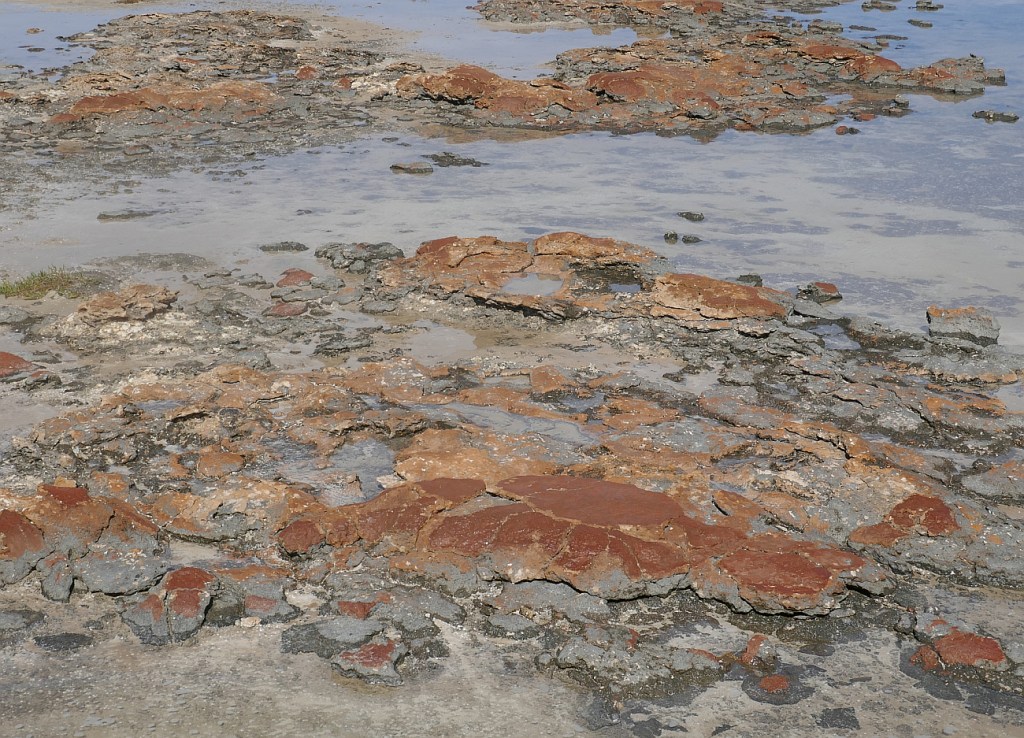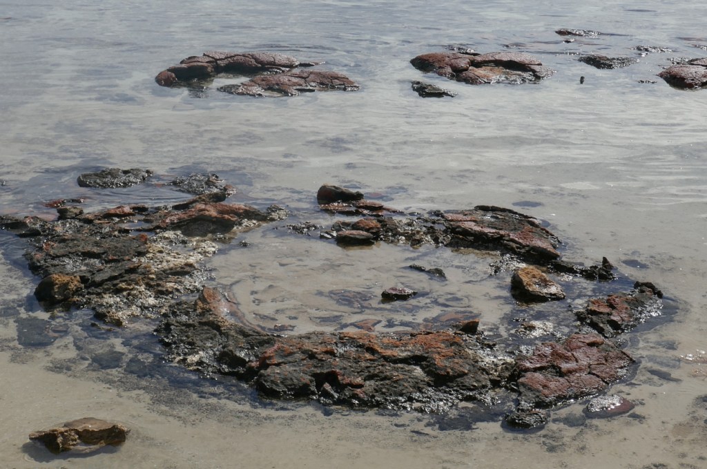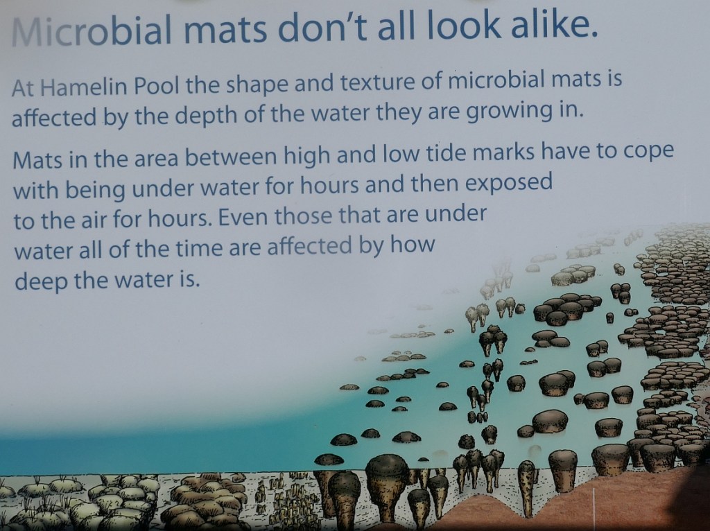 Before we checked out the board-walk, it was time to check the information boards. The first one told us that… “The ground here is alive and growing. It is covered with microbial mats, communities of microscopic life forms. In certain conditions the communities trap particles and create stone. When this happens, microbial mats become microbialites. Sometimes microbialites form taller layered structures called stromatolites.” This information was accompanied by the diagrams in the image to the left explaining I believe that flat, brown, broken rocks were microbialites and taller, chimney like structures were stromatalites. What we saw in the shallow water in front of us are captured in the two photos below